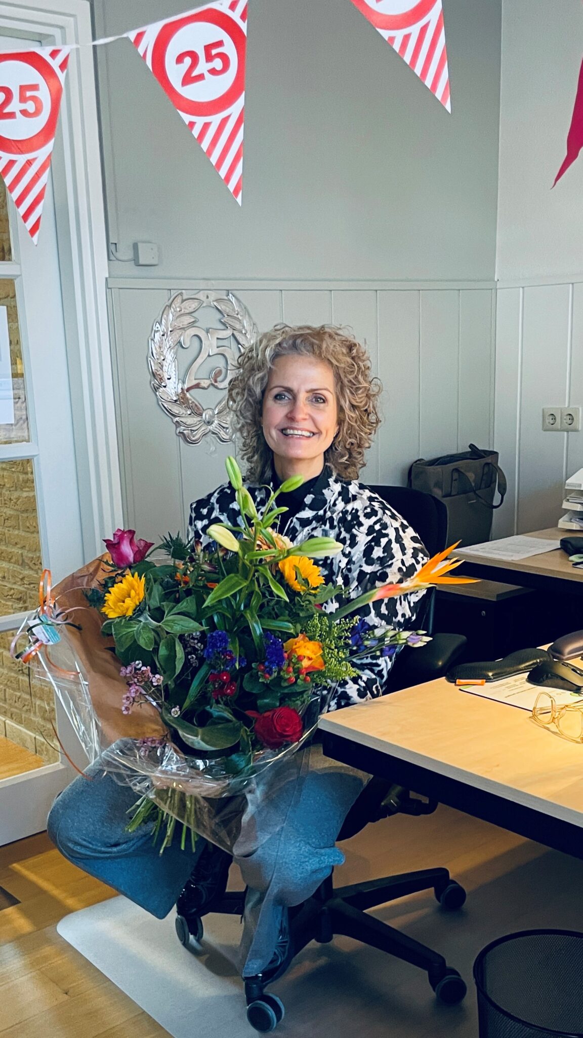 Zo’n bijzonder jubileum mocht natuurlijk niet ongemerkt voorbijgaan. Vanmorgen werd Sandra verwelkomd op een prachtig versierde werkplek en met een mooie bos bloemen. En dit heuglijke feit gaan we uiteraard samen vieren!